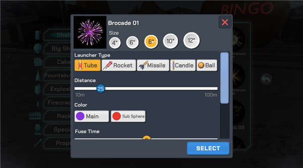 8、我们选择一个并点击,就会弹出这样一个界面,在这里可以选择烟花的大小、发射器的类型、烟花发射的距离、烟花引线燃烧的时间等等。