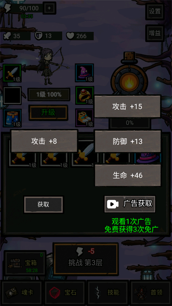 拉弓防一波游戏中玩家在关卡中需要在限定波次内把所有怪物赶在高台血量消失前清理,无论是否胜利都可以获得经验与装备对自己强化,多样的技能让玩家可以发挥自己的想象力进行搭配,打造出属于自己的箭术风格。