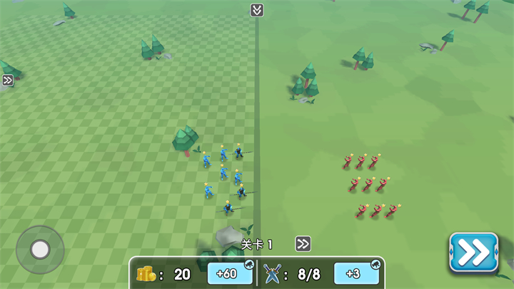 士兵如何站位也是非常具有策略性的,血厚的站在前排抵御伤害,骑兵放在边缘进行包抄,弓兵远程进攻,其中设计了很多的关卡等待玩家挑战,每一关都有不同的金币和上阵数量,后续的关卡回越来越难,非常具有挑战性。