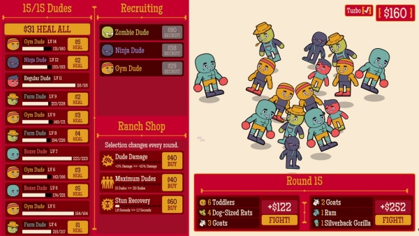 游戏非常的无厘头,敌人有可能是大鹅、熊孩子甚至是神明,玩家需要根据兄弟的专属技能和定位进行阵容搭配,每轮战斗后还能选择圣物强化战力,独特的美术风格然玩家爆爽游戏,从幼儿园打到南天门,极具戏剧感。