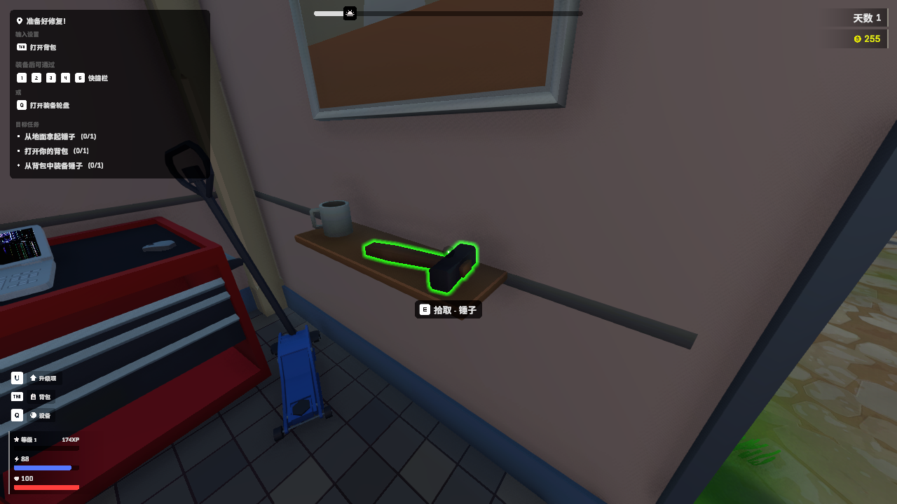 9、返回,来到一开始进入太平间右侧的角落就可以看到锤子,拿到后,点击tab”打开背包装备锤子。