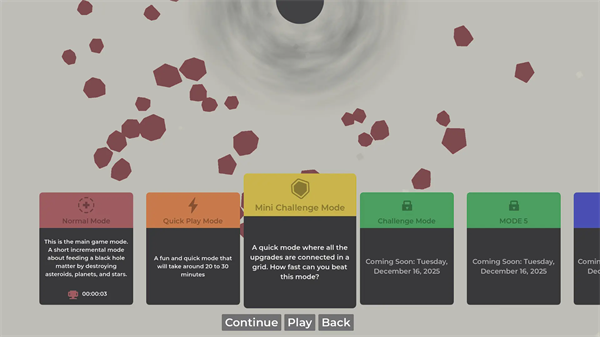 游戏的一大特色是其简约而震撼的画面表现。虽然采用极简的艺术风格,但游戏中黑洞吞噬天体的动画效果却极具冲击力。每一次成功的吸收都会伴随着炫目的粒子特效和光影变化,配合低沉的环境音效,营造出宏大而又神秘的宇宙氛围。为提供更舒适的视觉体验,游戏内置了深色模式选项。开启后,整个宇宙背景变为深邃的暗色调,星光点缀其中,不仅减轻眼睛疲劳,还能让玩家更专注于观察黑洞的成长轨迹和天体的动态变化,增强沉浸感。游戏设置了丰富的成就系统,如首次吞噬特定类型的天体、达到一定的质量阈值、连续在线时长等。完成这些挑战不仅能带来成就感,还能解锁独特的奖励和新内容,鼓励玩家不断尝试新的玩法和策略。