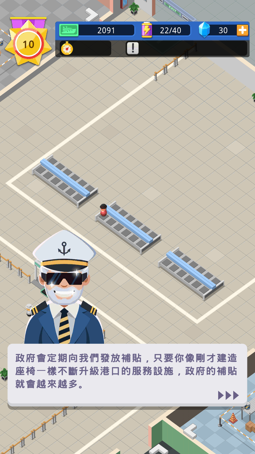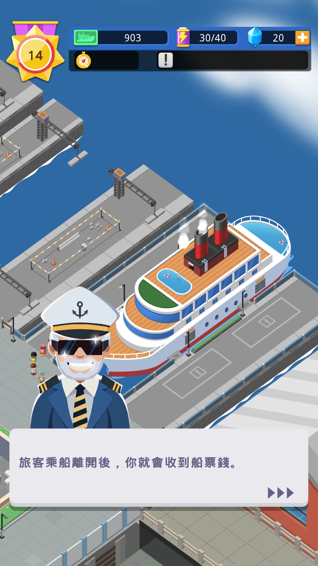 你需要对顾客进行按键,以免出现什么意外情况,港口大厅中可以建造餐厅、超市等来扩大收益,赚取的金币可以用来升级港口设施,只有不断完成任务赚取更多的钱才能完成自己的梦想,为了游戏更加轻松,即时离线也会获得收益哦。