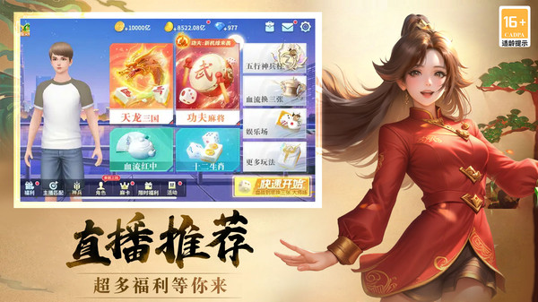 3D牌桌让你身临其境,超酷胡牌特效,百变装扮助你搓麻更带感!全国牌友实时对局,一键匹配各路雀神,1秒开局,快速流畅无需等待!