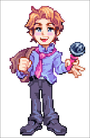 Senpai是一个电子游戏角色。他的样子是一个浅色皮肤的男高中生,脸上一直泛着红晕,留着偏分的草莓金发。他穿着一件部分折起来的蓝色纽扣衬衫,一条宽松的粉色领带、灰色牛仔裤、一条银色扣子的黑色腰带和灰色鞋子。他右手将一个棕色的背包背在右肩上,左手用拇指和食指松松地拿着一个粉红色的麦克风。每当他不唱歌时,他的头就会闪闪发光