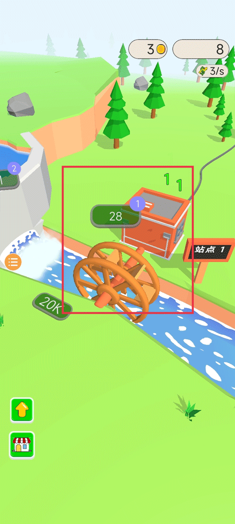 1、打开游戏,首先点击绿色按钮“2”,就能立马建造一个水力发电机。