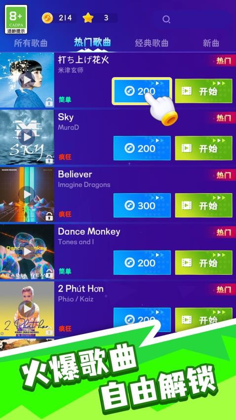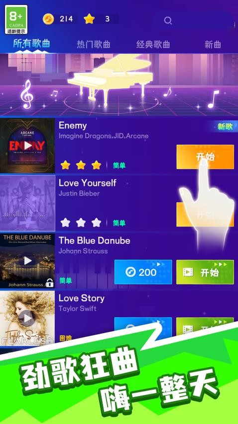 1、进入游戏,先完成新手关卡,完成后,根据自己的喜欢挑选心仪的歌曲。