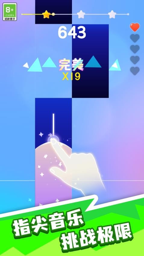 钢琴方块下落速度递增,迅速适应速度变化才能获得更高分数,任何中断的情况都会降低得分。