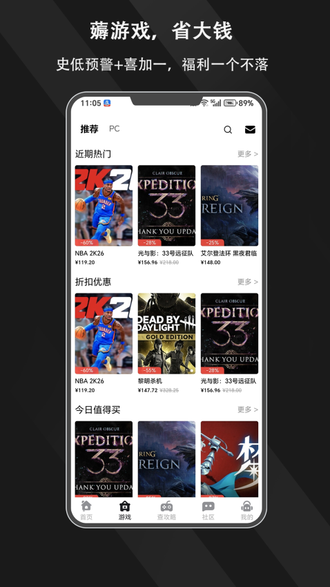 2、进入游戏页面可以看到诸多近期热门和折扣优惠,便于选择体验;
