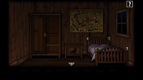 点击过道上的相框,查看提示,进入房间,按顺序点击床角的四个鸟骨,获得小鸟标记的柜子里的【火柴】;