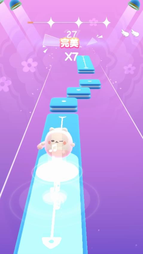 1、当小猫成功落在琴键方块上之后,你还要观察前方所出现的白色圆点,跟随这些圆点跳跃。