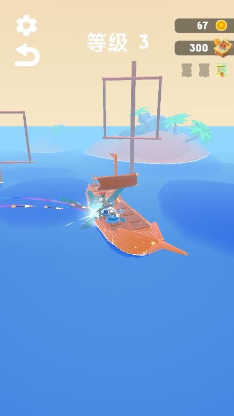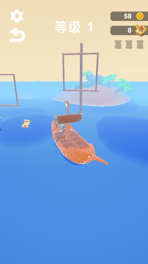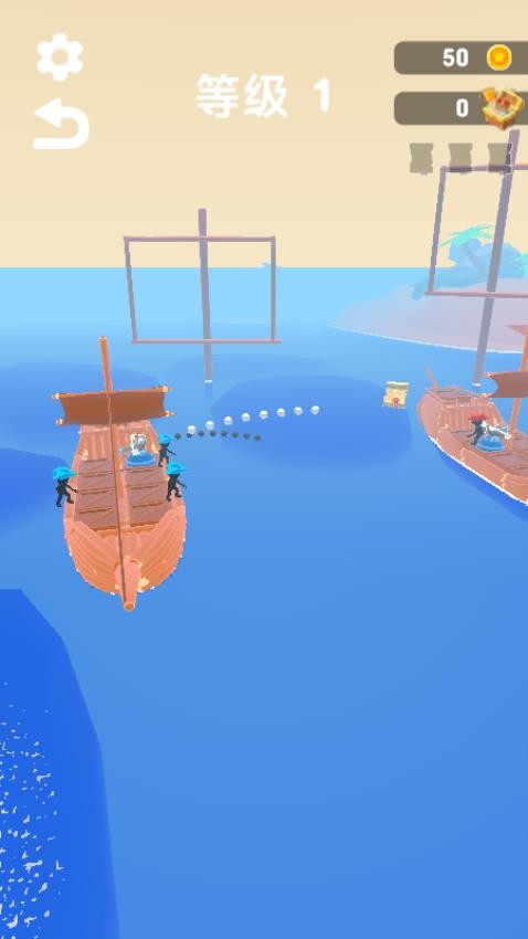 玩家以触屏操作参与海上战斗,战前通过合并相同类型武器(如基础弩炮)合成更高阶、火力更强的攻城武器,布置在己方战船上。战斗中操控战船移动规避敌方炮火,精准瞄准并发射武器攻击敌船,优先打击敌船武器系统以削弱其火力,同时收集战场掉落的金币与地图碎片。金币可用于解锁战船皮肤、购买武器,地图碎片集齐后能解锁隐藏宝藏。