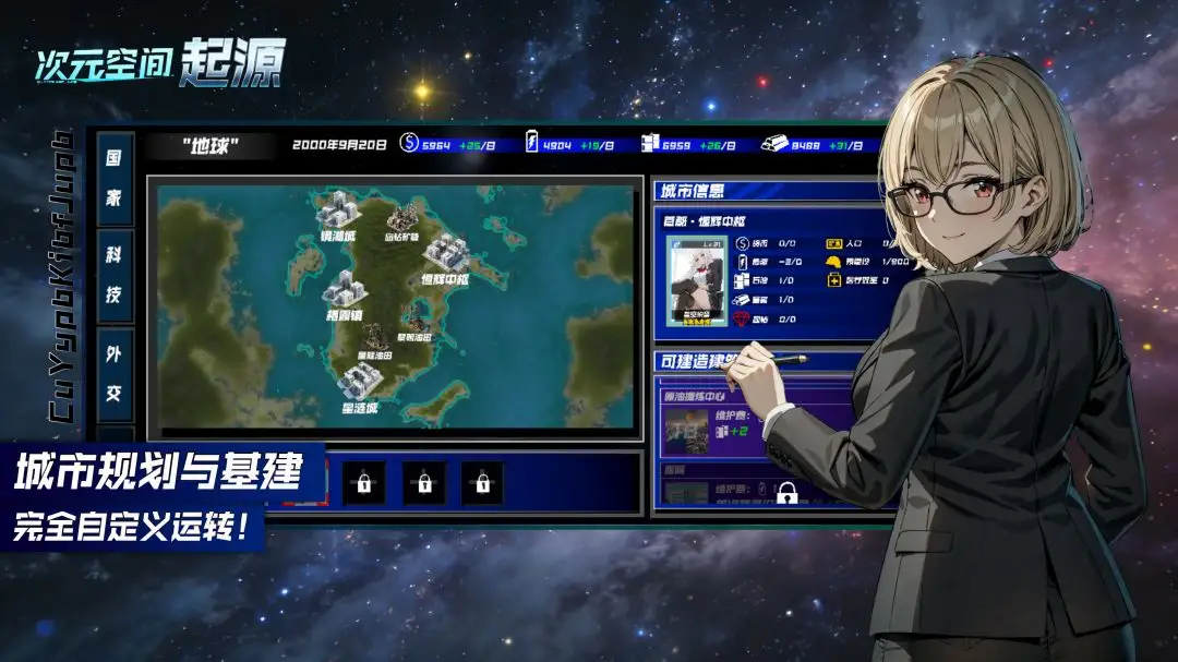 次元空间起源是一款二次元策略游戏,在游戏中您将扮演刚刚完成国内统一的国家星空盟邦的第一任总统,您需要处理与各国的外交事务或研发国家科技,提高本国综合国力,提高或降低目标国家的好感度,通过战争或邀请加入联邦的形式统一全球,发展太空科技,踏上宇宙征服之路。