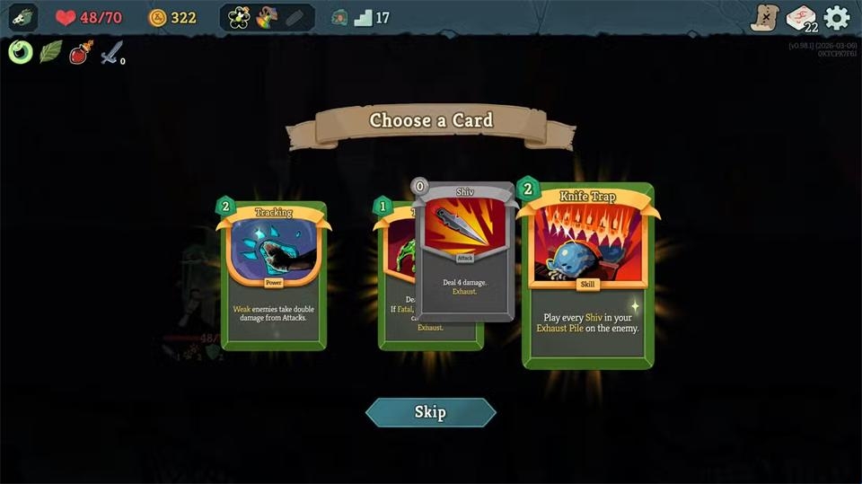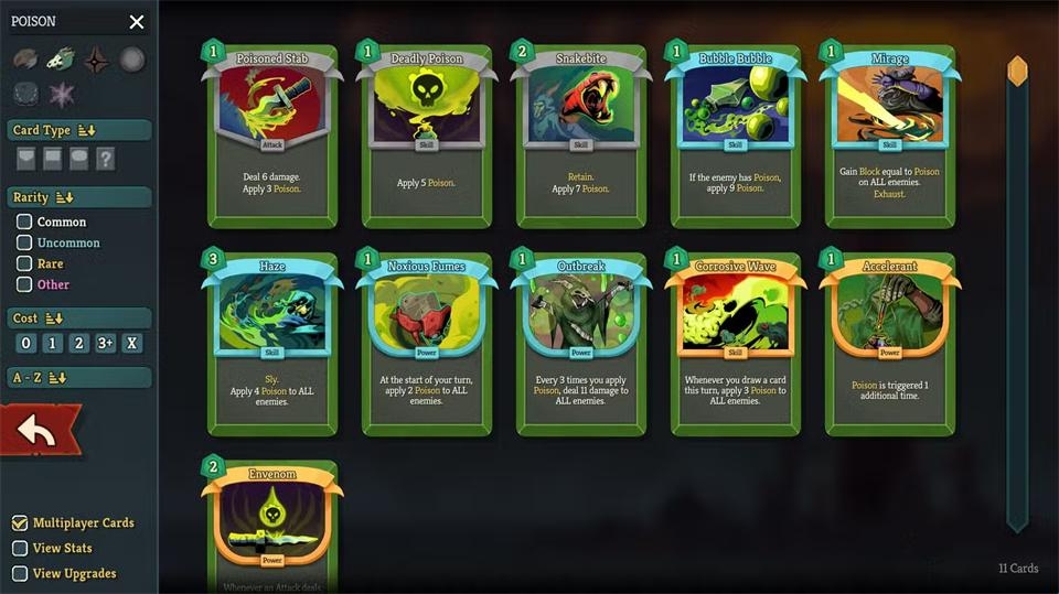 掌握卡组构建的核心在于理解不同体系的构建逻辑。这意味着要寻找能产生协同效应的特定卡牌(包括遗物!),从而打造爆发性回合。对于静默猎手而言,她的三大主题是毒性、抽牌/弃牌以及匕首。