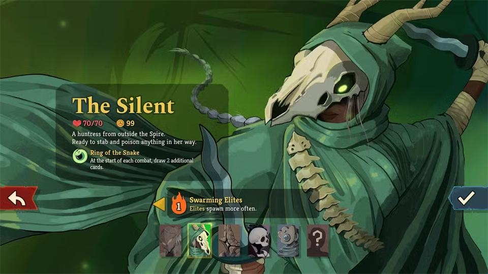 静默猎手(The Silent)是一位追求速度、每回合出多张牌并毒害敌人的女猎手。