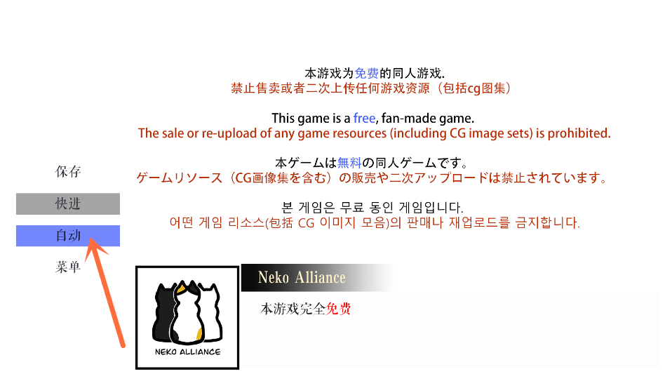 2、游戏剧情部分采用视觉小说形式,可以直接点击左侧的自动选择让游戏自动播放。