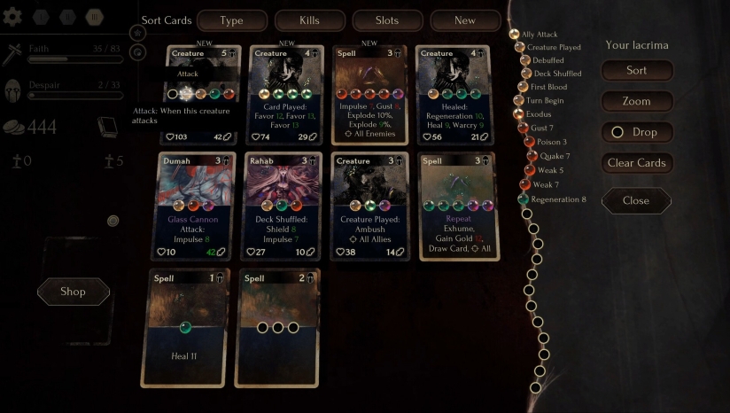 游戏采用2.5D画面,在保持策略游戏清晰视角的同时,通过层次感丰富的场景营造出独特的黑暗幻想美学。卡牌本身的视觉设计尤为精美,每张卡牌都是一件独立的艺术品,插画风格既符合游戏整体的黑暗基调,又各具特色。界面设计注重信息清晰度,例如通过添加小图标显示卡牌是否已精通,悬停时显示抽牌堆、祝福和诅咒的总数等,使玩家能够快速掌握关键信息,做出决策。游戏支持手柄操作,并提供了帧数限制选项,允许玩家根据自身设备情况调整性能表现,确保游戏运行的流畅性。