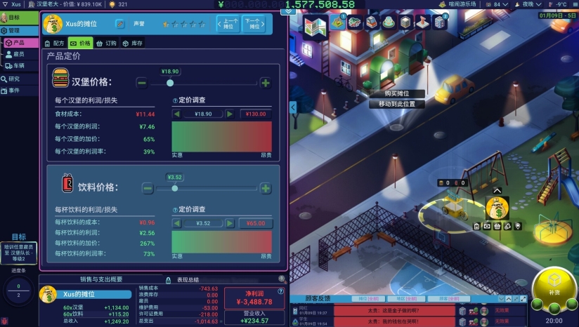 本作的一大特色是深度的经济模拟系统。游戏模拟了城市的经济动态(繁荣、衰退或萧条),直接影响经营决策。玩家需要面对15个拥有独特市场条件和货币的全球城市,每个城市中的价格与货币均与现实中相对应,增加了经营策略的多样性和挑战性。游戏中的市场环境是动态变化的,突发事件(如恶劣天气、经济变化、食材短缺)会考验玩家的应变能力。同时,游戏提供了详细的财务报告,玩家需要根据数据分析优化运营。其高度的可重复游玩性得益于程序生成的事件和多样的策略选择,确保每一局游戏体验都有所不同。