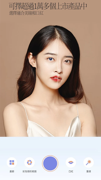请通过相机应用程序体验实际销售的彩瞳和口红产品。现在试穿后再买吧。