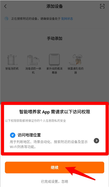 3、系统将弹出位置权限请求,点击继续以允许访问地理位置,用于设备搜索与Wi-Fi配置。