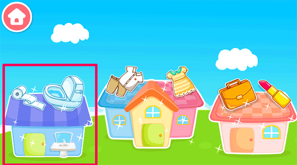1、打开宝宝性别认知游戏,找到并点击最左边红色方框内的厕所场景按钮;