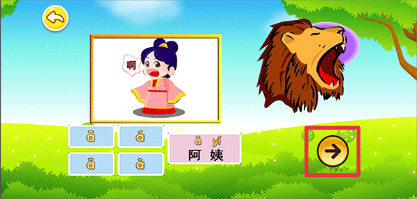 2、进入后,让孩子根据语音、图片进行学习拼音,学完当前拼音后点击箭头学习下一个