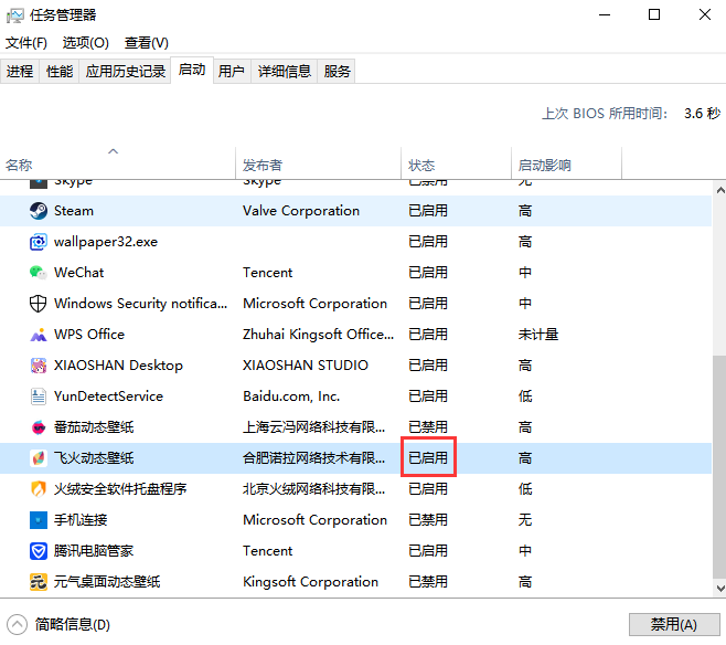 2.点击“启动”栏,找到飞火动态壁纸的启动项管理,然后右击框选出的启动状态,将其调整为已启用即可。