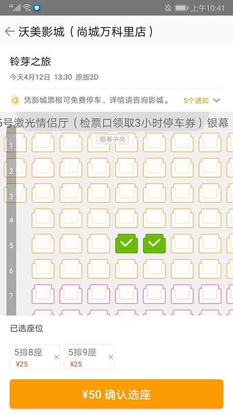 6、进入【选座】界面,勾选好座位后,选择【确认选座】选项,
