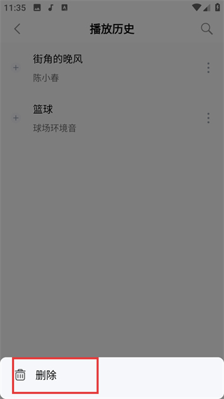 4、在操作菜单里选择【删除】选项,就能将该歌曲从播放历史中移除,清理播放记录啦。