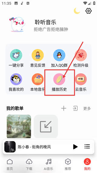 2、在个人中心页选择【播放历史】选项,就能查看之前播放过的歌曲列表,快速找回听过的内容哦。