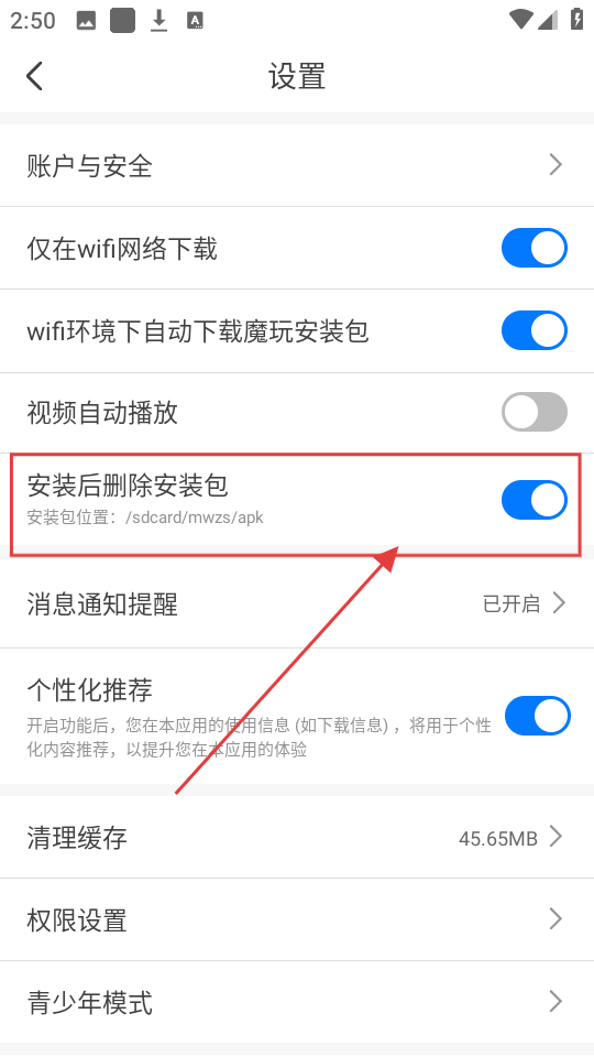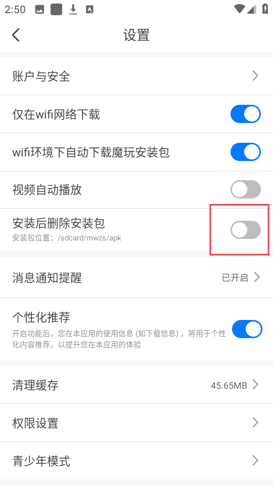 3、设置里的【安装后删除安装包】功能可开启,能节省手机空间,很实用哦。