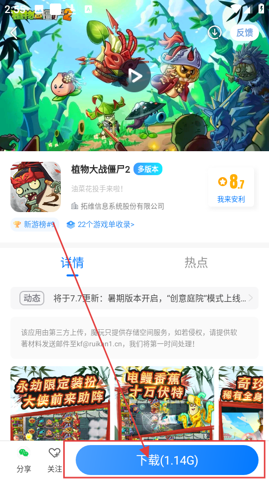 4、进入游戏详情页后,点击【下载(1.14G)】,可开始下载该游戏,完成后即可游玩哦。