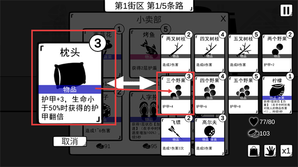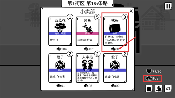 2、在【小卖部】中,消耗【91】货币可购得【枕头】,其效果为【护甲+3,生命小于50%时获得的护甲翻倍】。