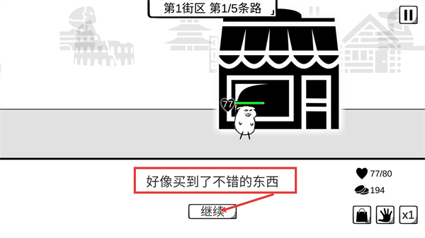 4、出现【好像买到了不错的东西】提示后,点击【继续】按钮,回到街区继续推进当前路段的流程。