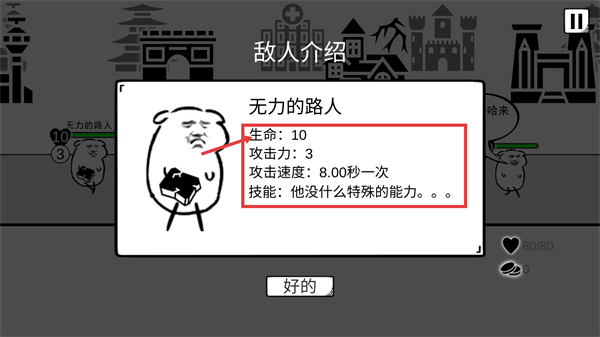1、了解【无力的路人】属性:【生命-10】【攻击力-3】【攻击速度-8.00秒一次】且无技能,可轻松应对。