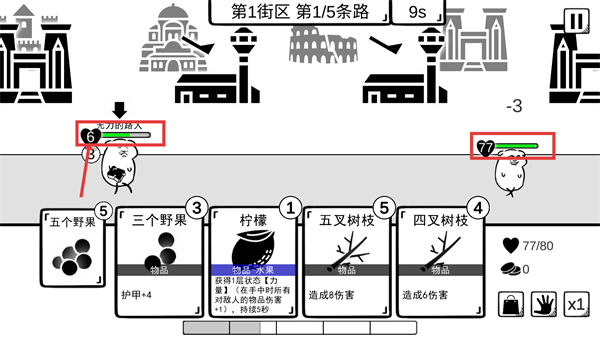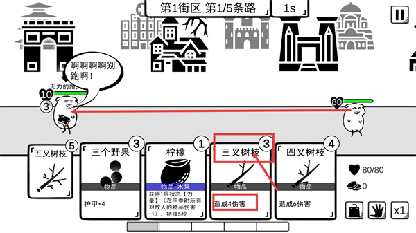 2、在【第1街区-第1/5条路】中,使用【三叉树枝】对敌人造成【4伤害】,推进战斗进度。