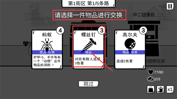 4、出现【请选择一件物品进行交换】提示时,可选【螺丝钉】,其能对所有敌人造成【3伤害】提升输出。