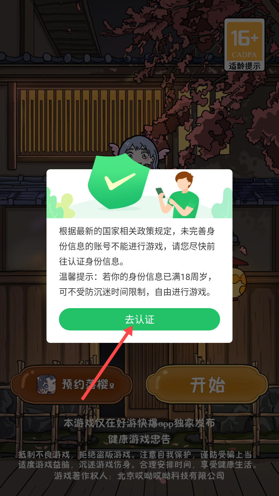 1、进入游戏,点击【去认证】。