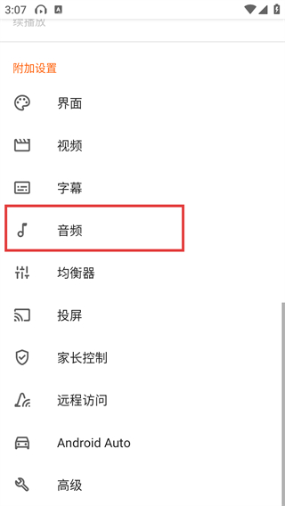 3、【VLC】设置界面的【附加设置】中,点击红框标注的【音频】选项进入专属设置页。