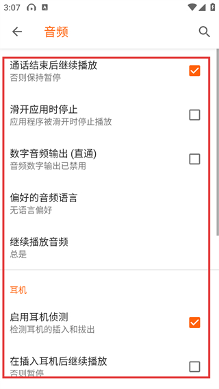 4、【VLC】音频设置界面,可在红框区域调整【通话结束后继续播放】【启用耳机侦测】等音频参数。