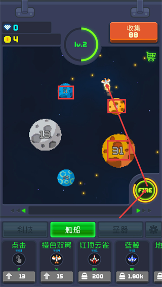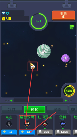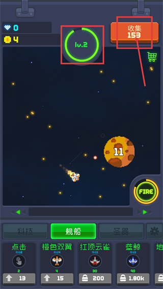 2、升级至【lv.2】后,使用【FIRE】功能攻击带数字标识的星球,清理目标以提升游戏内的进度数值。
