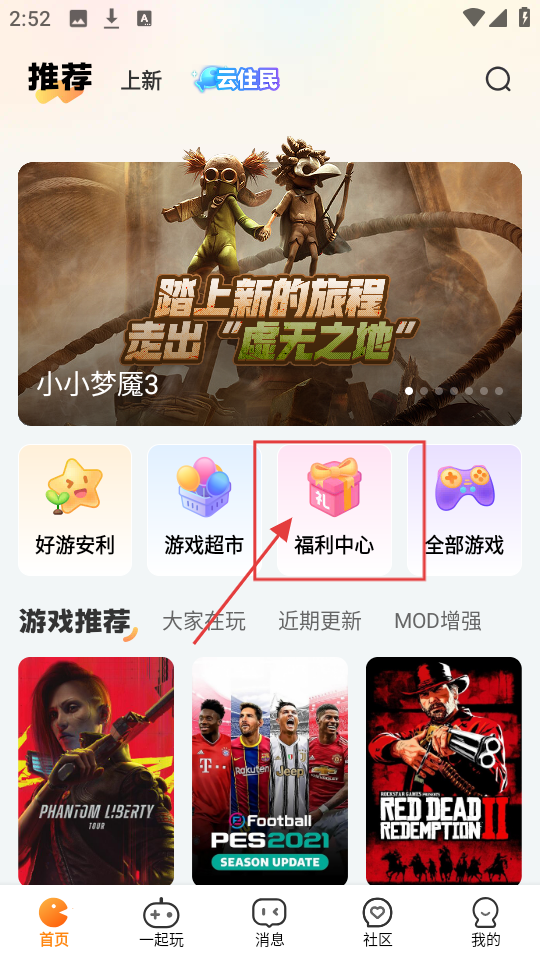 1、若想领取游戏福利,点击【福利中心】图标,进入福利中心页面,开启福利领取操作。