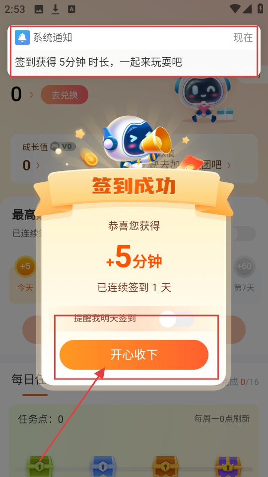 4、签到成功后,会弹出【签到成功】提示,点击【开心收下】,领取获得的游戏时长奖励。