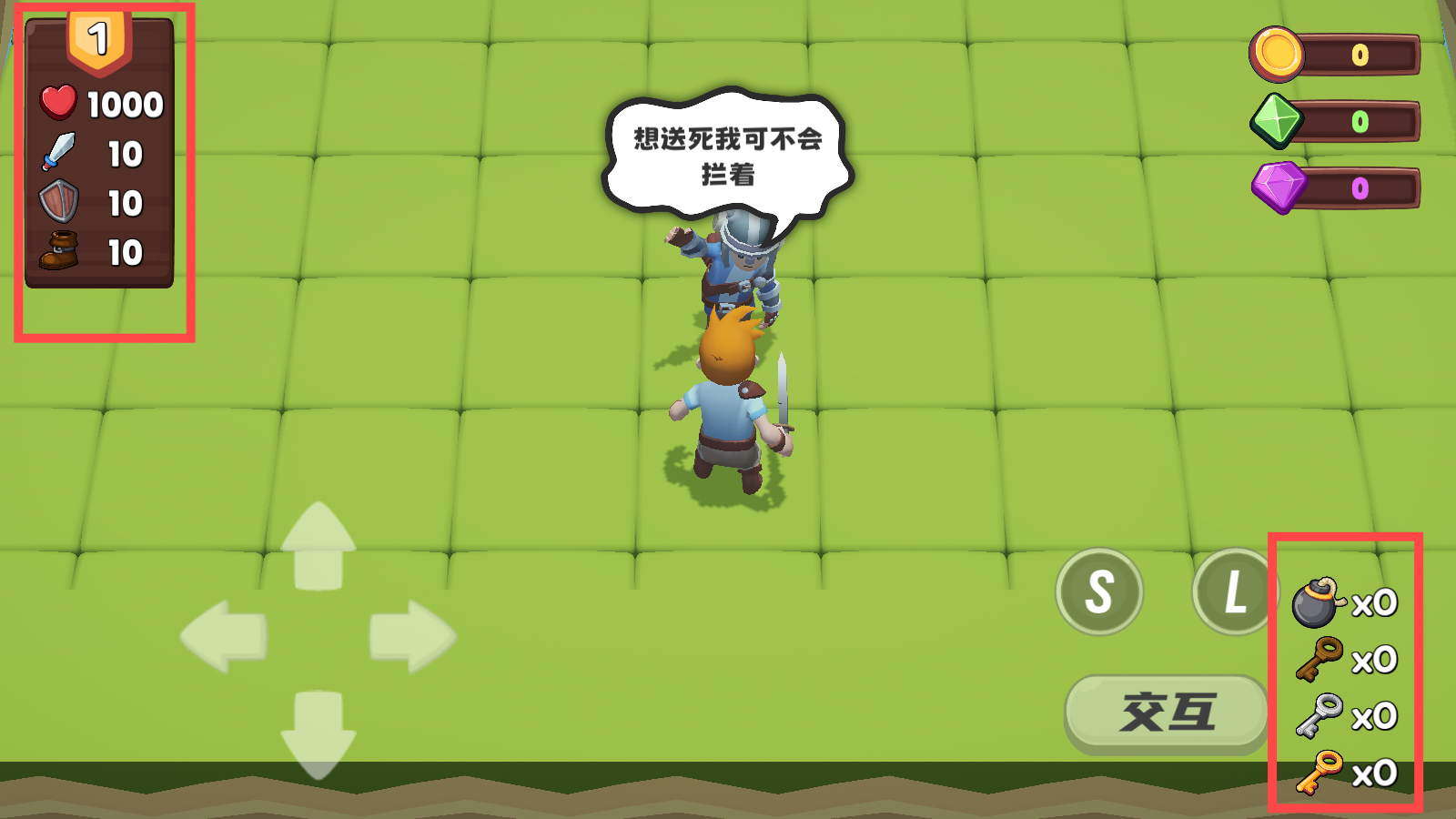 3、关注屏幕左上角角色属性面板,屏幕右侧道具合理使用来攻克关卡,与场景中的角色通过【交互】获取信息或任务提示。