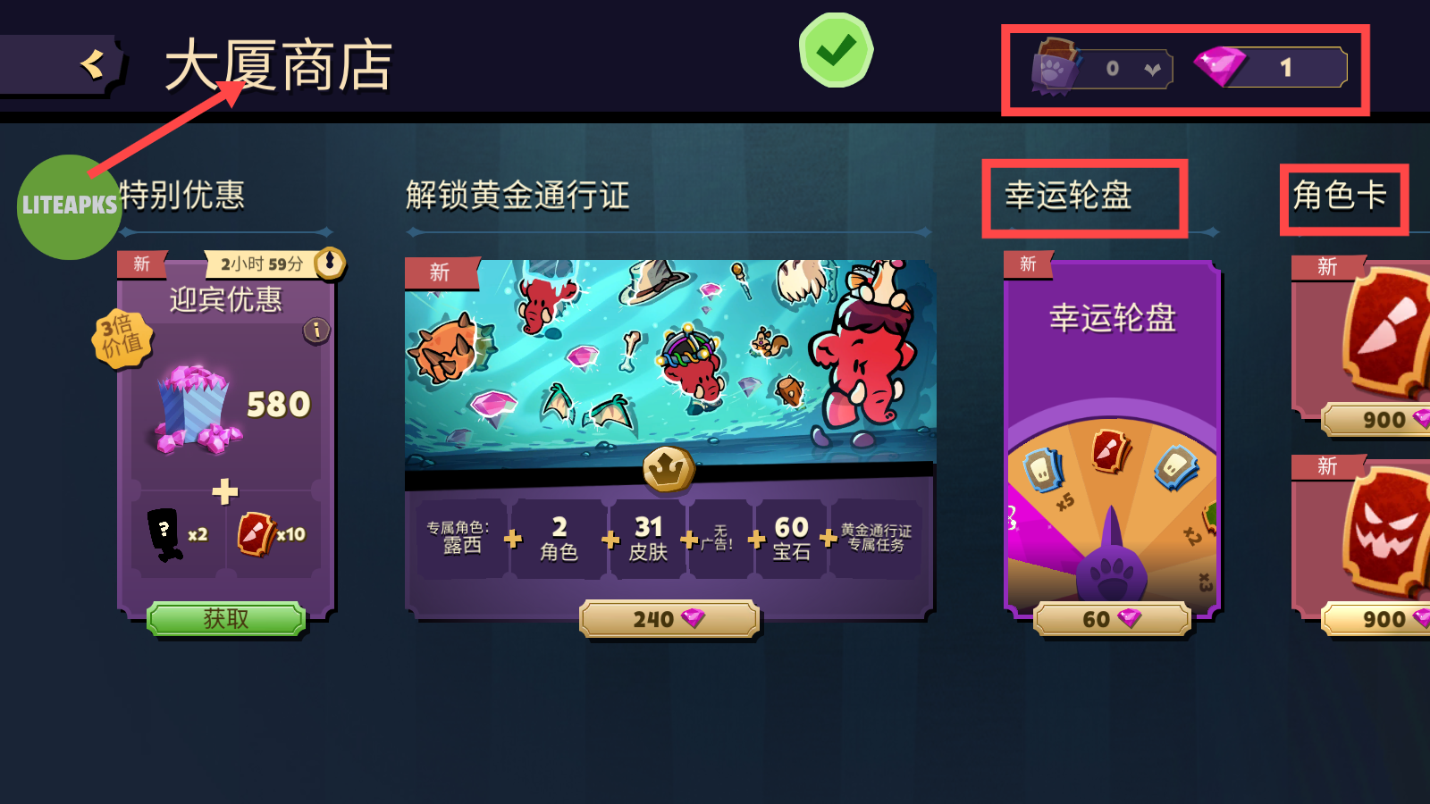 2、进入【大厦商店】,通过【幸运轮盘】或购买【角色卡】获取新角色,合理使用资源提升体验。