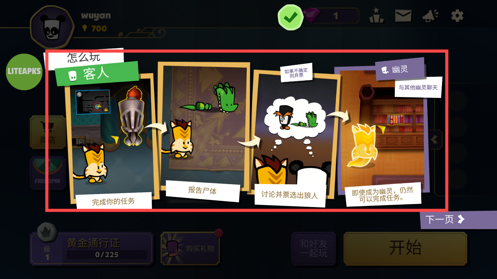 3、作为【客人】先【完成任务】,发现异常【报告尸体】,再【讨论票选狼人】,成【幽灵】也可继续任务。