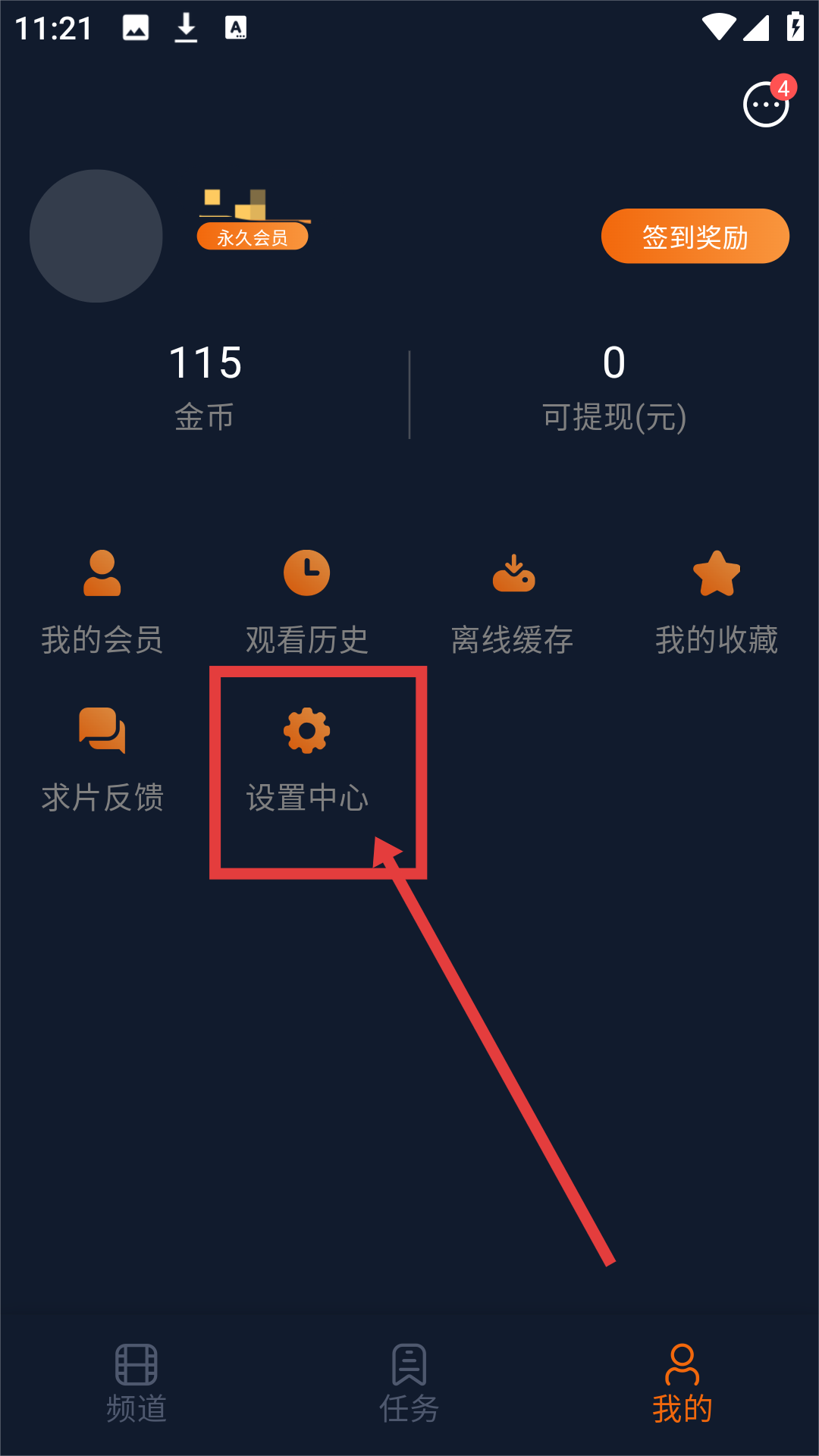 1、在个人页面,点击【设置中心】,可进入设置中心页面,准备调整软件主题啦。