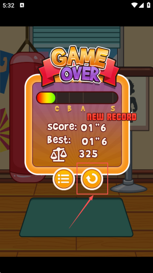 4、刷新纪录:当画面显示“OVER DEW RECORD score:01"6 Best: 01"6”,点击继续按钮,立即开始新一轮计时挑战。