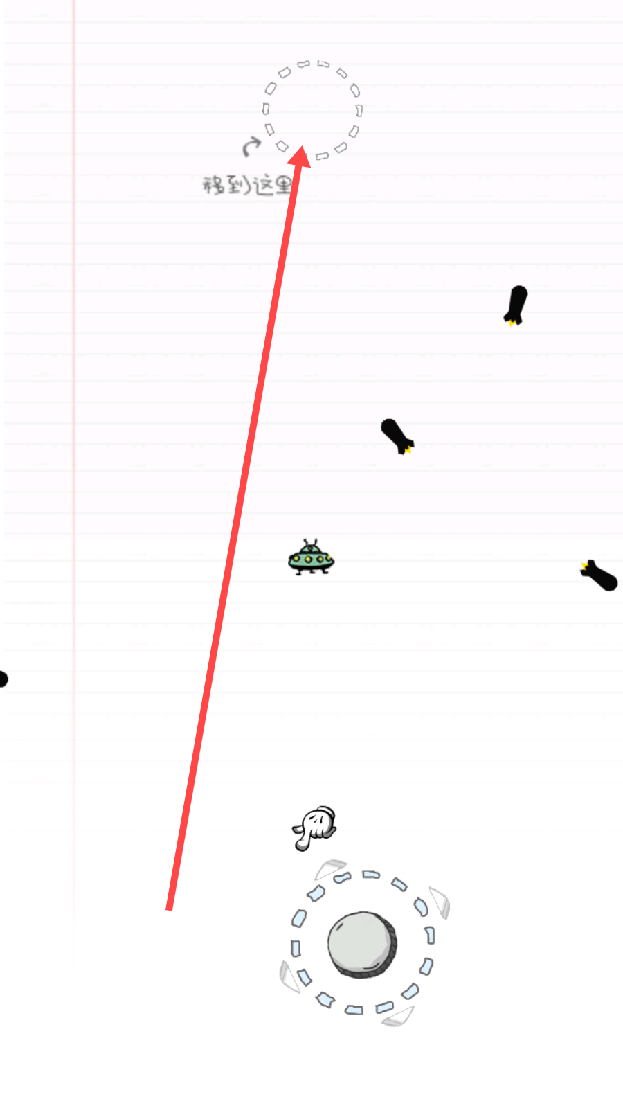 1、进入游戏,通过拖动飞船躲避导弹的袭击,到达指定位置就能通关。