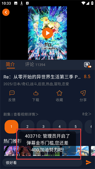 4、发送弹幕后,若收到金币门槛提示,可通过积累金币来满足发送条件哦。